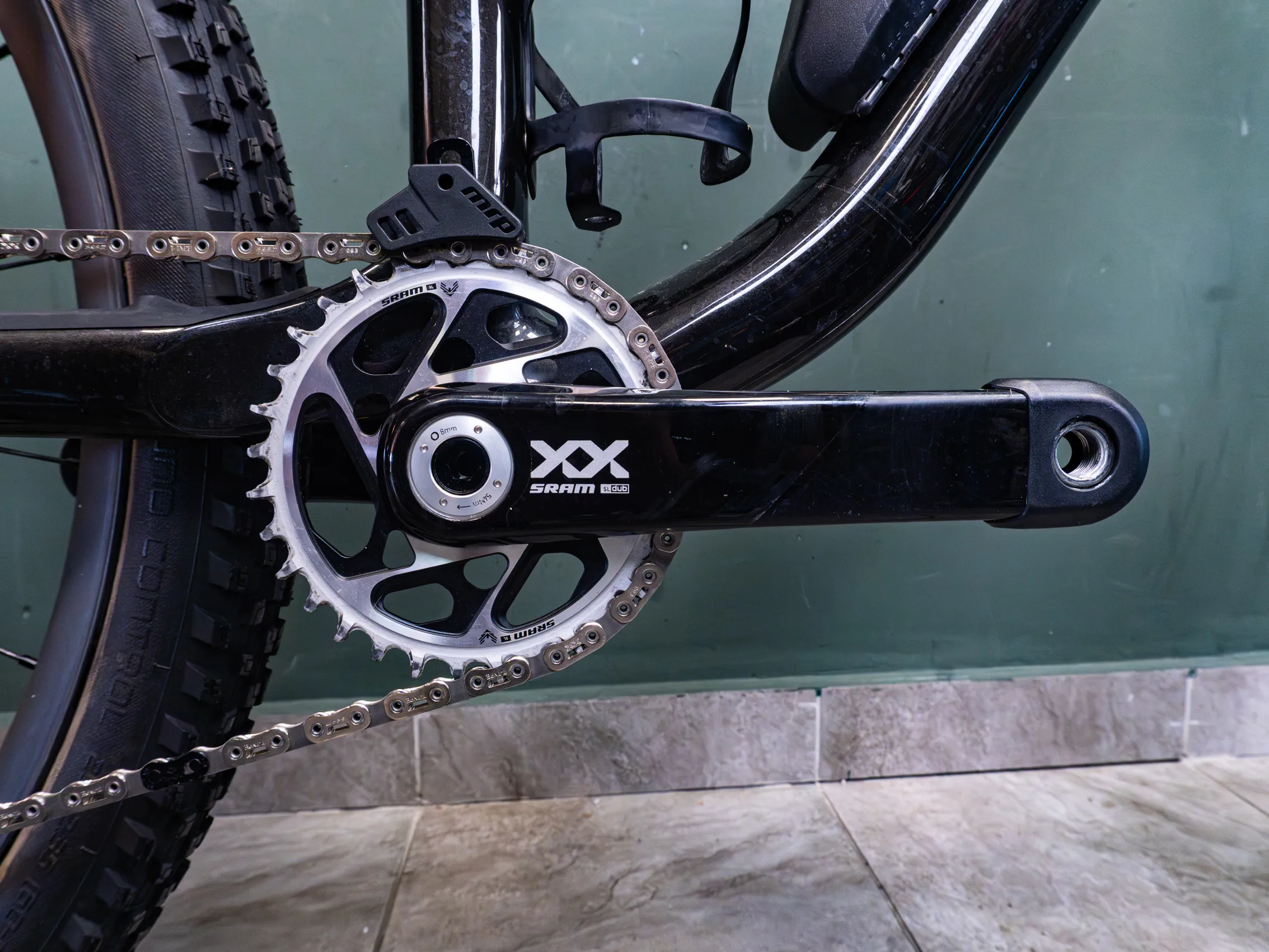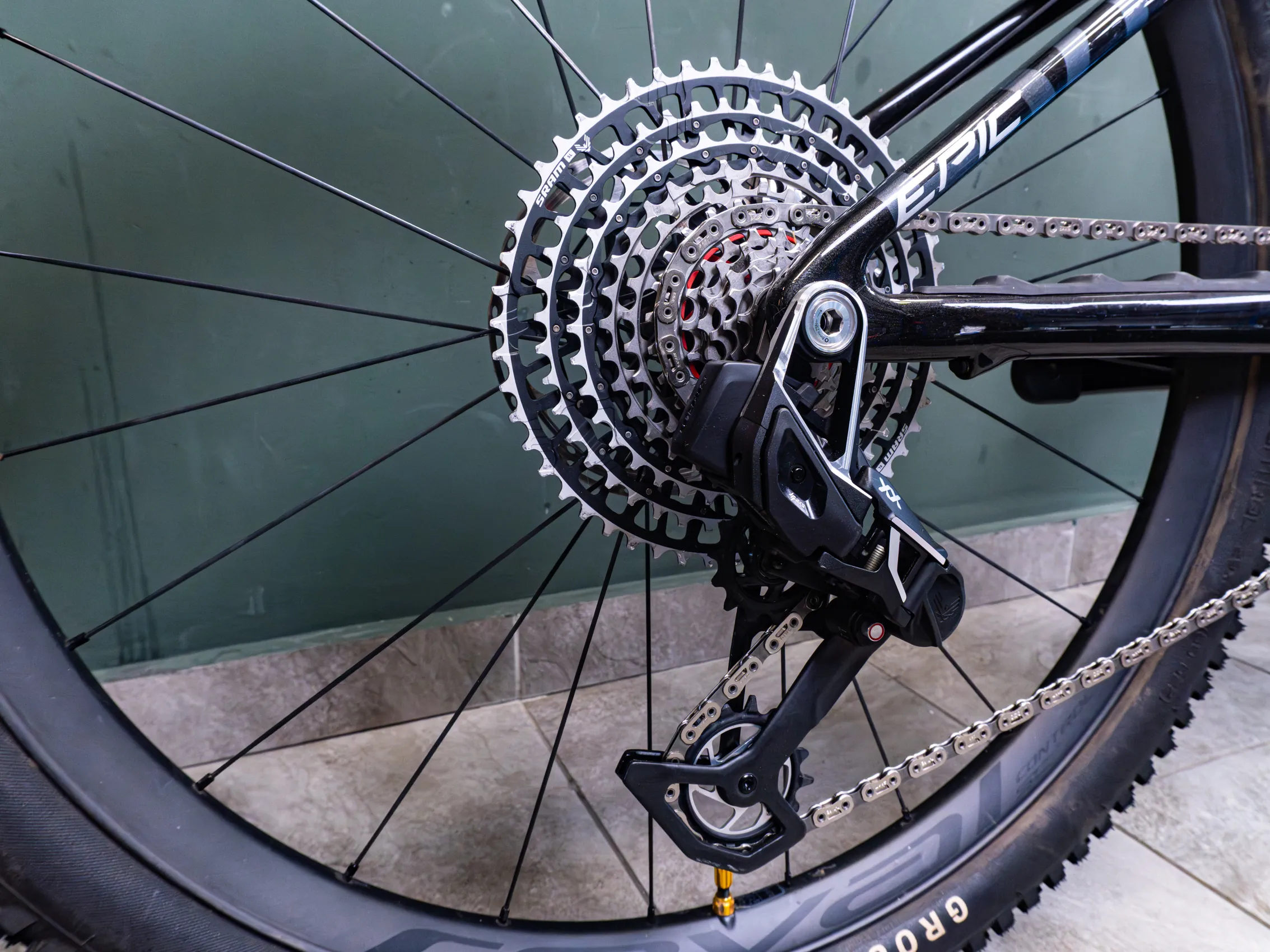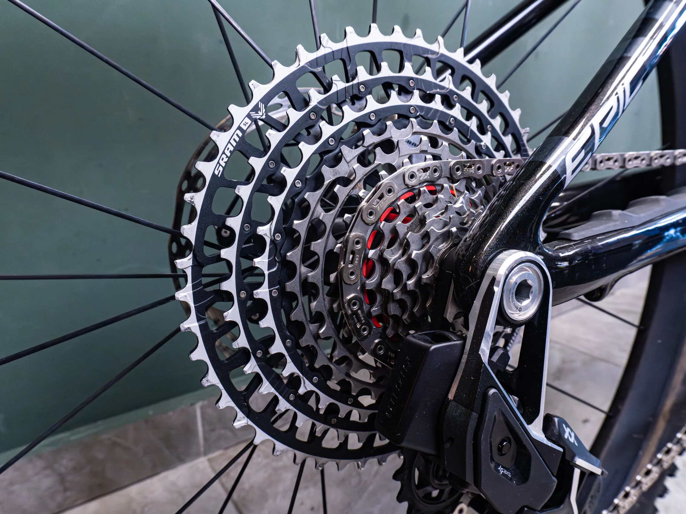 – Sram XX AXS groupset, 10-52 casette, 175mm cranks, 32T chainring